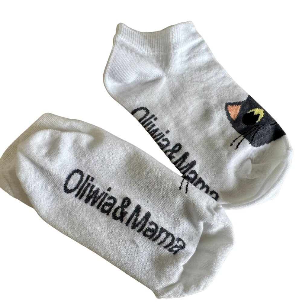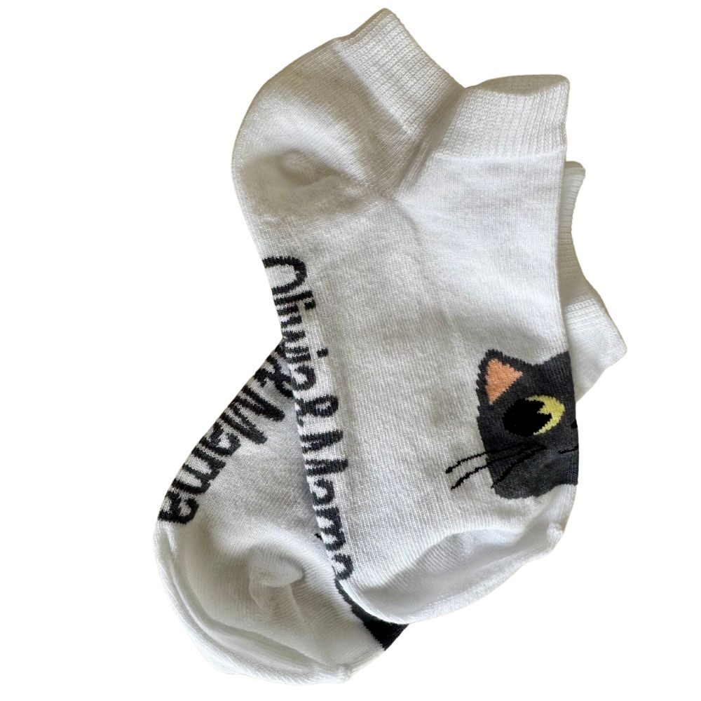 Miękkie, wygodne i pełne uroku! Białe skarpetki z wesołym motywem kota i napisem Oliwia&Mama to idealny dodatek dla każdego fana naszej społeczności. Doskonałe do noszenia na co dzień – do szkoły, na spacer czy po domu.